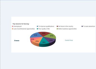 Το άρθρο σημειώνει πως στην Ελλάδα της κρίσης παρατηρείται μια καταστροφική διαρροή «εγκεφάλων» που μην μπορώντας να αντέξουν την κατάσταση στη χώρα τους, δελεάζονται από άλλες χώρες της Ευρώπης (και όχι μόνο) που τους υπόσχονται καλύτερες προοπτικές. Οι εκτιμήσεις κάνουν λόγο για 180.000-200.000 καλά εκπαιδευμένους Έλληνες πολίτες που αναγκάστηκαν να φύγουν από τη χώρα τους, τα τελευταία χρόνια.