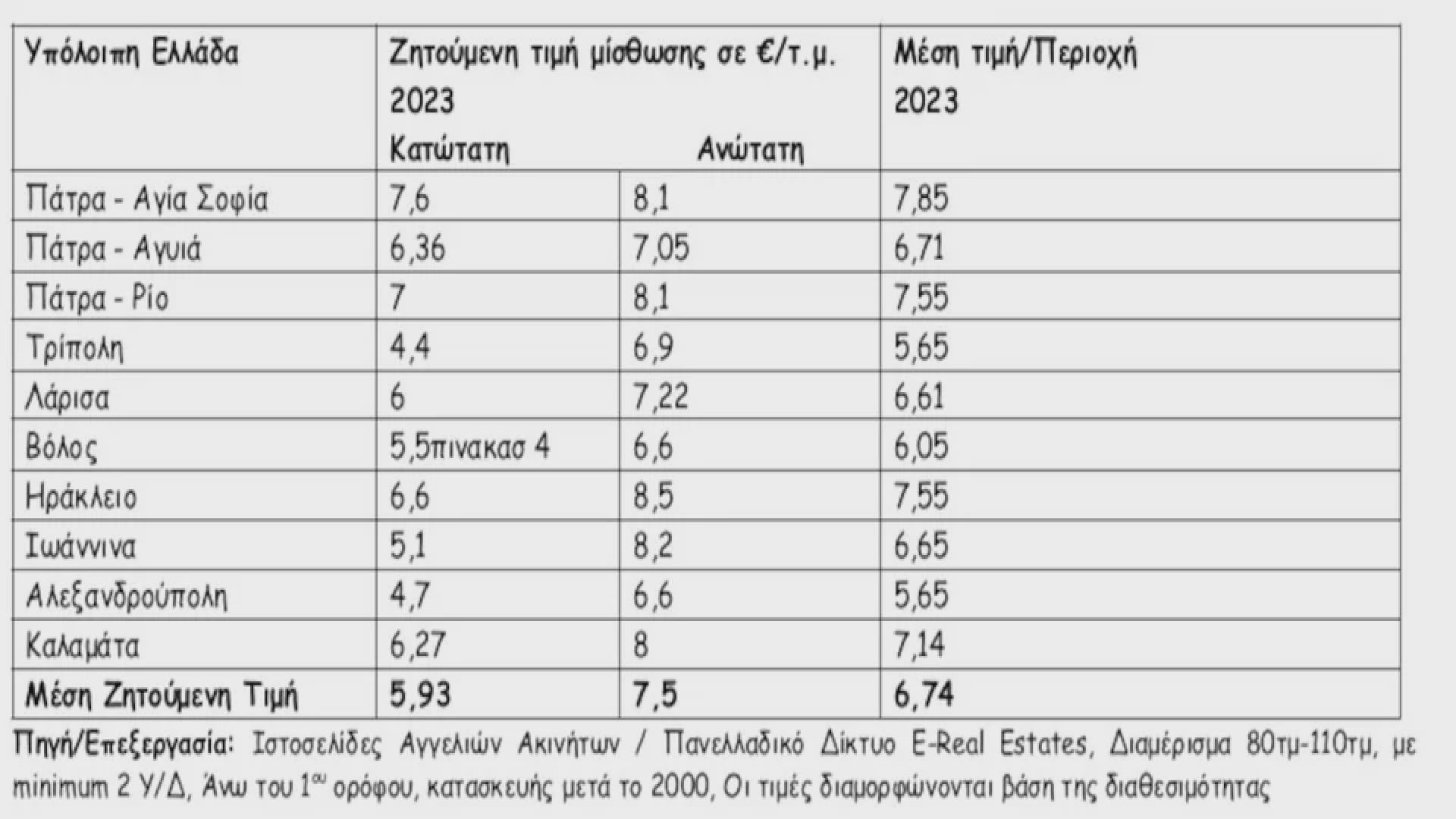Η μέση κατώτατη ζητούμενη τιμή μίσθωσης διαμορφώνεται στα 6,19 (5,4 €/τ.μ το 2022) και η μέση ανώτατη στα 7,48€/τ.μ (6,4 €/τ.μ. το 2022), ενώ η μέση τιμή μίσθωσης κυμαίνεται στα 6,84 €/τ.μ (5,9 €/τ.μ. το 2022) για παρόμοια κατοικία. Επομένως, το μέσο ζητούμενο μίσθωμα για κατοικία 100τμ θα κυμανθεί από 619€/μήνα έως και 748€/μήνα.