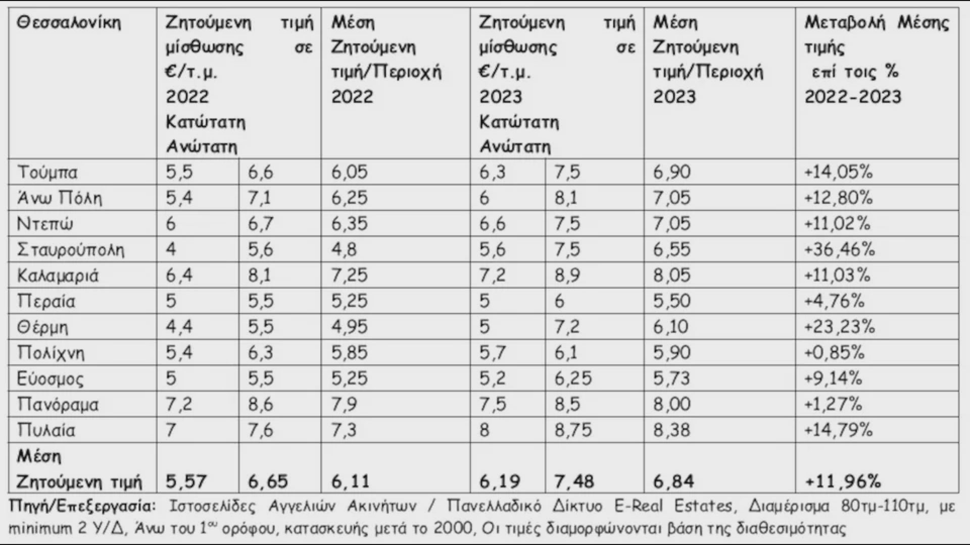 Στη Θεσσαλονίκη, σύμφωνα με τα στοιχεία που προκύπτουν από τις διαθέσιμες αγγελίες ακινήτων για κατοικίες κατάλληλες για οικογένειες, η μέση ζητούμενη τιμή μίσθωσης κυμαίνεται στα 6,84€/τ.μ. (5,9 €/τ.μ. το 2022) για διαμέρισμα 80τμ-110τμ άνω του 1ου ορόφου, κατασκευής μετά το 2000.