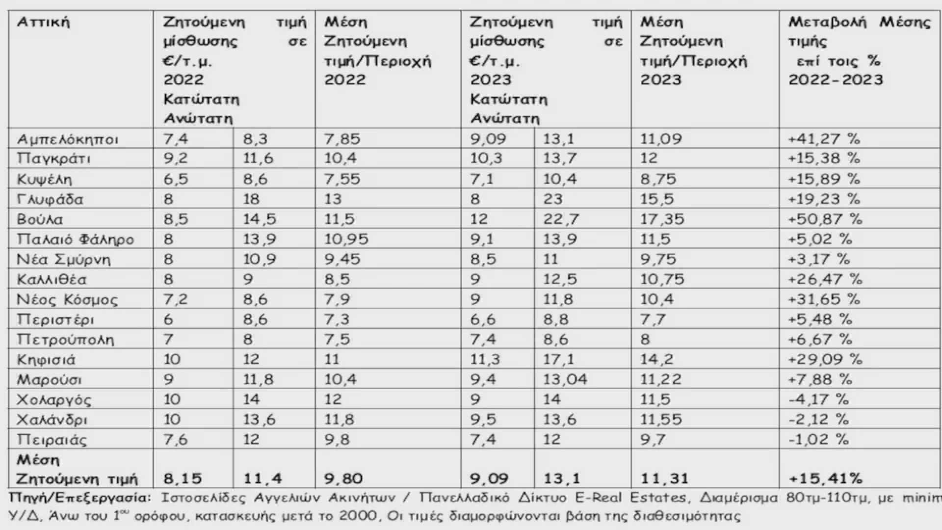 Σύμφωνα με τα στοιχεία που επεξεργάστηκε το Πανελλαδικό Κτηματομεσιτικό Δίκτυο E Real Estates και προκύπτουν από τις διαθέσιμες αγγελίες ακινήτων σε περιοχές της Αθήνας με τη μεγαλύτερη ζήτηση από οικογένειες για ενοικίαση κατοικίας, η μέση ζητούμενη τιμή μίσθωσης κυμαίνεται στα 11,31€/τ.μ. (9,8 €/τ.μ. το 2022) για διαμέρισμα 80τμ-110τμ άνω του 1ου ορόφου, κατασκευής μετά το 2000.