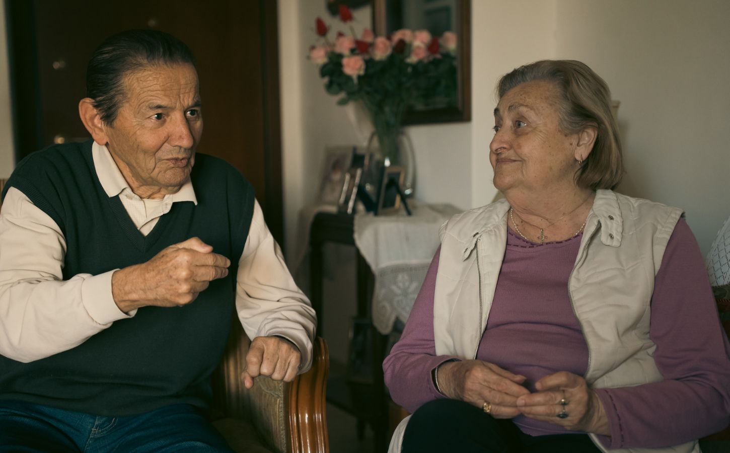 60 χρόνια μαζί. Πώς είναι αυτό, ρωτάω με απορία. «Είμαστε μαζί από το 1966. 60 χρόνια μαζί. Εγώ τον έχω πατέρα, αδερφό, τα πάντα. Ο άντρας μου είναι όλα μαζί, λατρεία. Υπήρχε πάντα αγάπη, σεβασμός και υπομονή. Έτσι πορευόμασταν πάντα. Πριν κοιμηθούμε το βράδυ, σχεδόν μια ώρα συζητάμε και φέρνουμε μπροστά μας σαν κινηματογραφική ταινία όλο το παρελθόν. Λέμε πώς γνωριστήκαμε, συζητάμε για τις όμορφες και τις άσχημες μέρες μας.