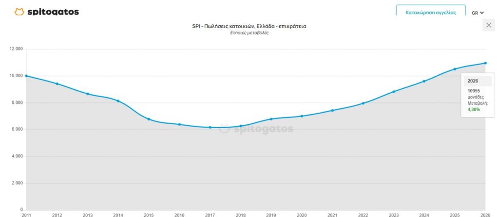 Σε επίπεδο Ελλάδας, το 2026 έχει ξεκινήσει με μια αύξηση 4,30% στις πωλήσεις κατοικιών και 2% στις ενοικιάσεις, δείχνοντας ότι η αγορά παραμένει σε τροχιά ανόδου, αλλά με πιο συγκρατημένους ρυθμούς.